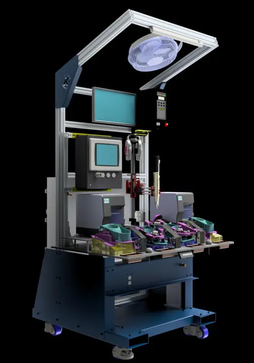 is a standardized ergonomic assembly station that provides a cost-effective, high-quality manufacturing solution. KIMASTLE has provided assembly solutions for a magnitude of industries. With this knowledge, we have focused our efforts on the latest trends in the manufacturing industry. The two areas every top manufacturer focuses on are standardization and flexibility. Every manufacturer invests in tooling products that will help increase efficiencies within their process, and KIMASTLE understands how important this investment is to the success of the product and manufacturer. The K-Base is a standardized design that has many options and configurations to accommodate a large majority of today’s manually assembled products. The K-Base provides a high-quality powder-coated steel base with an extruded aluminum overhead structure that can accommodate many different types of tooling and automated controls. The aluminum plate worksurface supports a wide variety of tooling and its electric motor-controlled height adjustment offers extensive flexibility for all operators. This adjustable work surface can accommodate dedicated, subplate, and quick interchangeable tooling to provide a range of tooling solutions to competitively meet target price points.